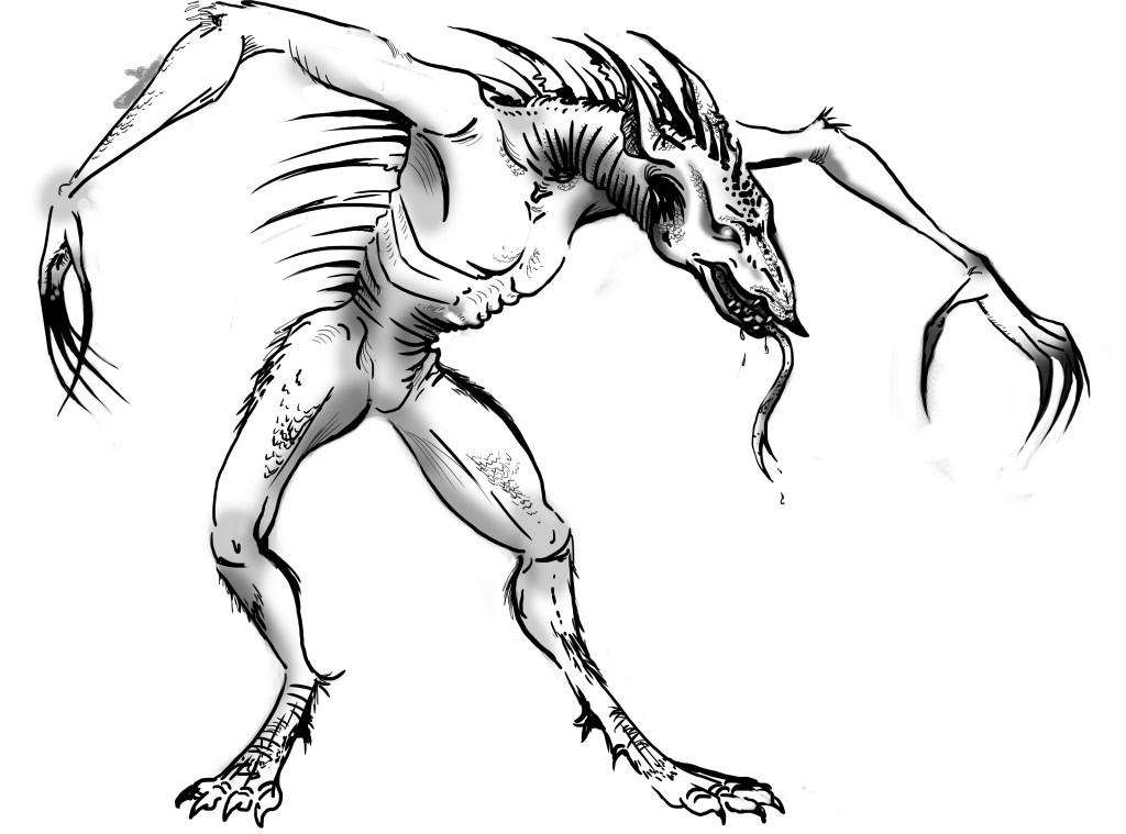 Original illustration: I wanted to create a cross between a wolf and tall man with elongated limbs.