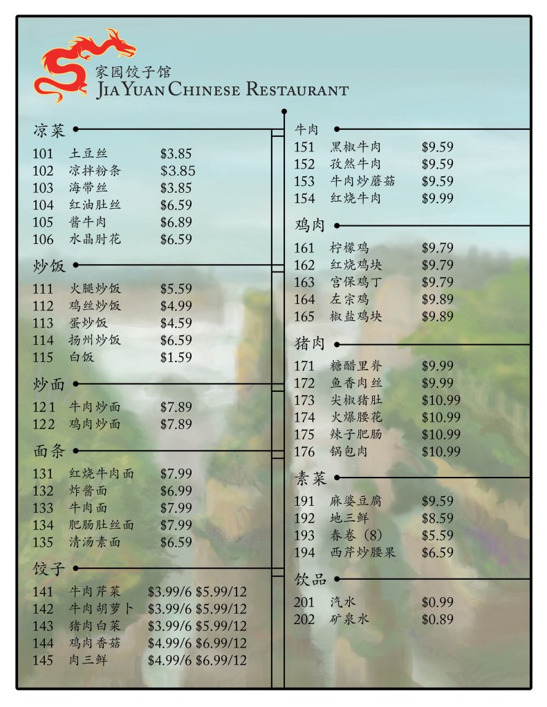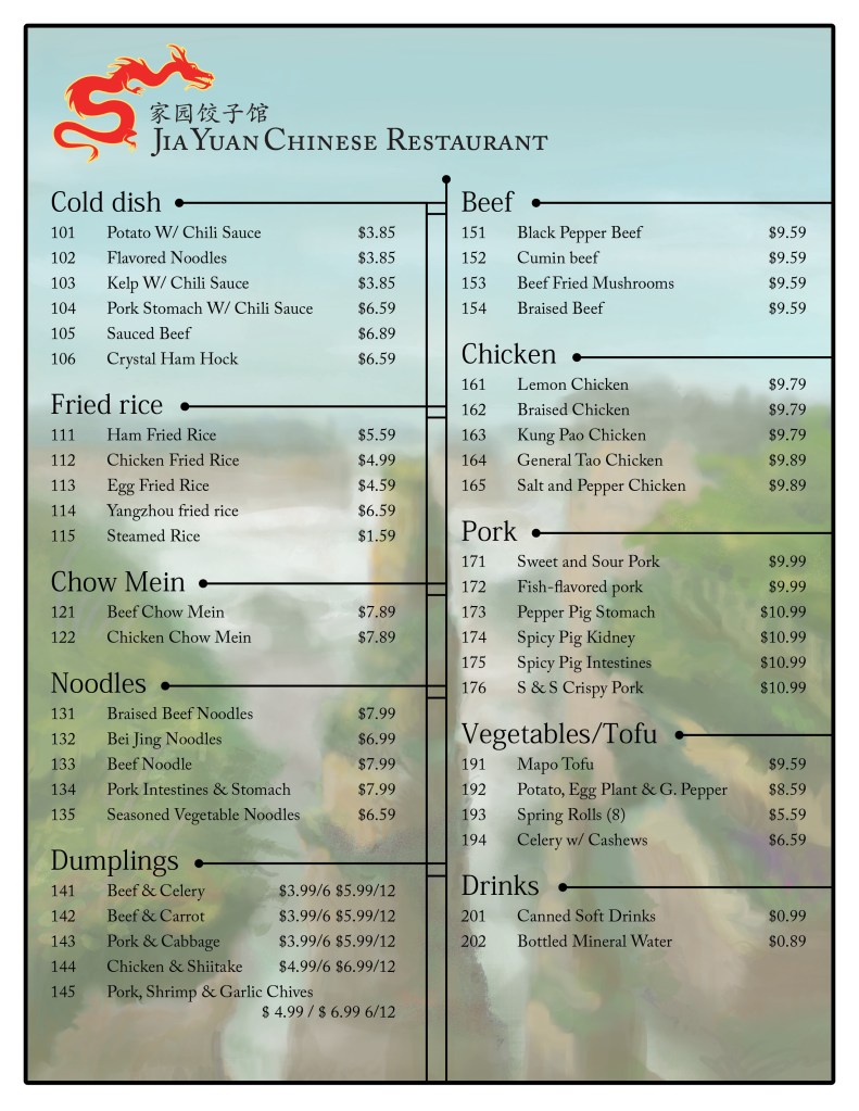 The Menu include Chinese and English type for their customers. They requested an aspect of their home land to be incorporated in the design. So I digitally painted a soft illustration for the background of the menu that featured Yuanjiajie 袁家界 of China.