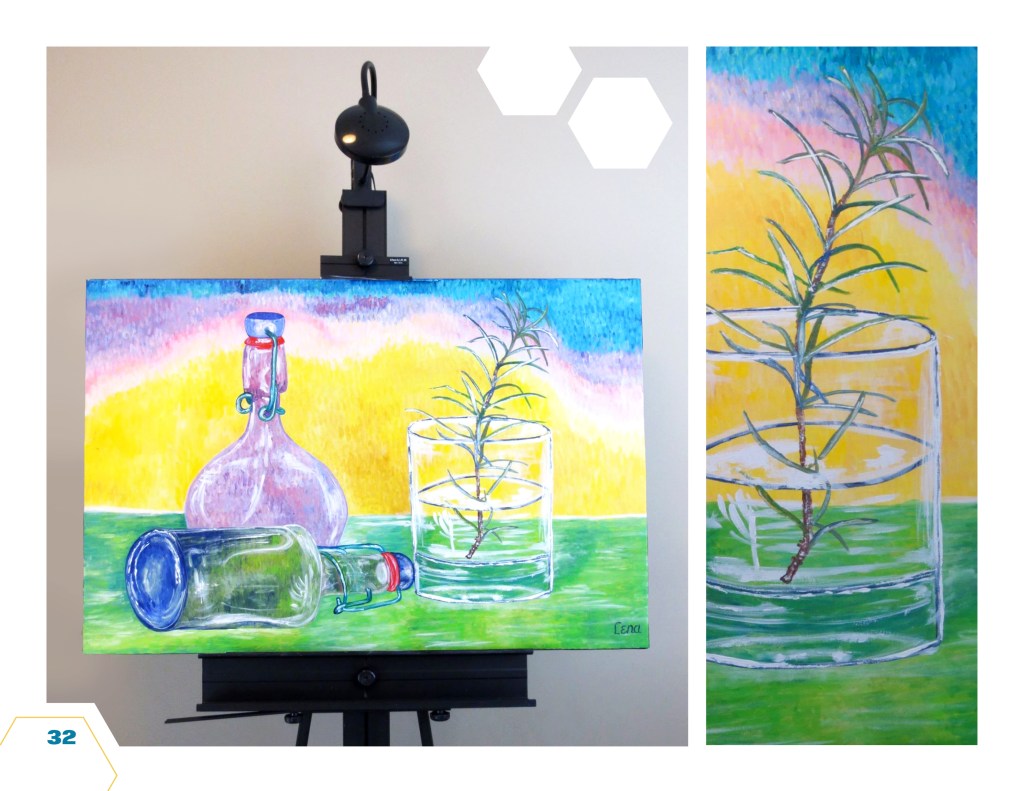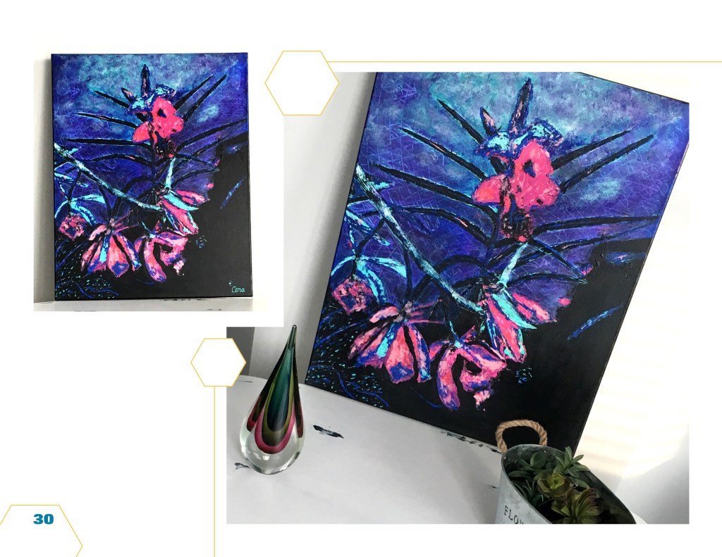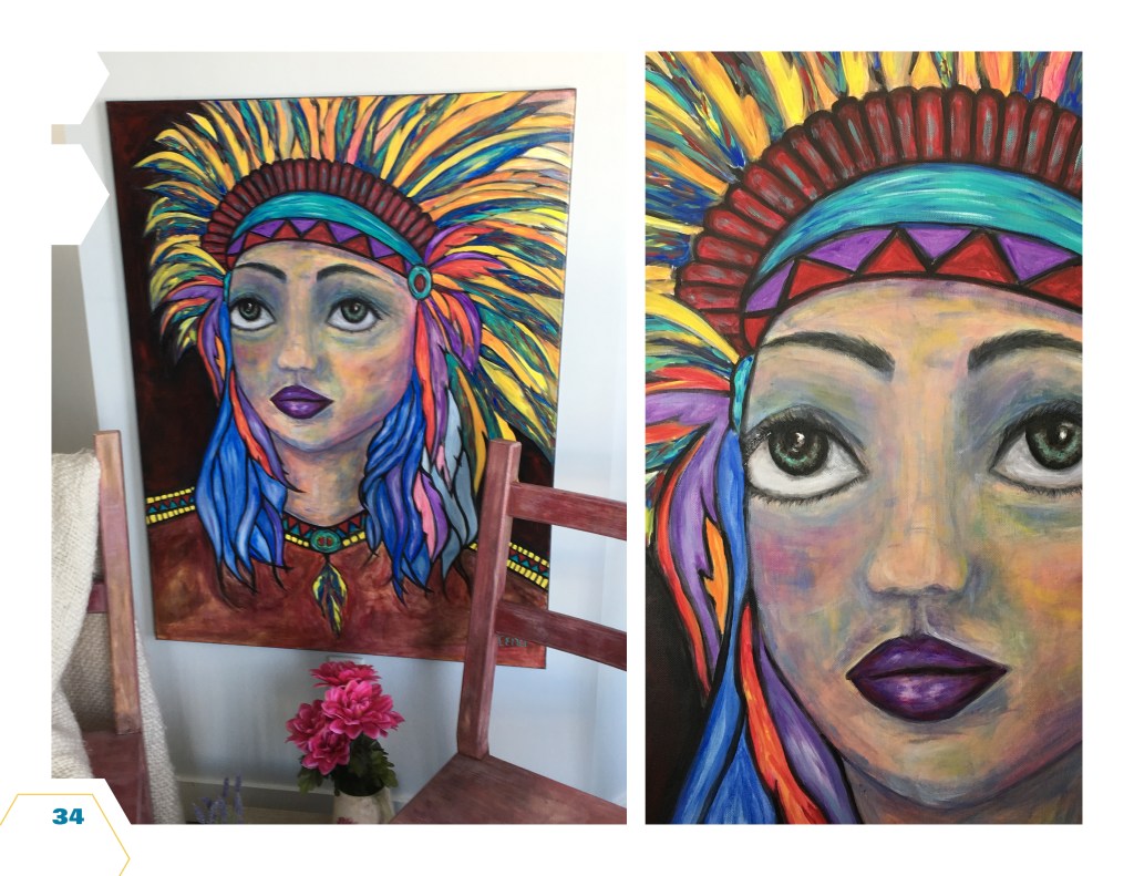 I saw welcoming and warm colours though her work. I took inspiration from her work for the colour pallet, as well and how she chose to stage the works. I produced a page layout for the client to allow each piece to shine and flow.