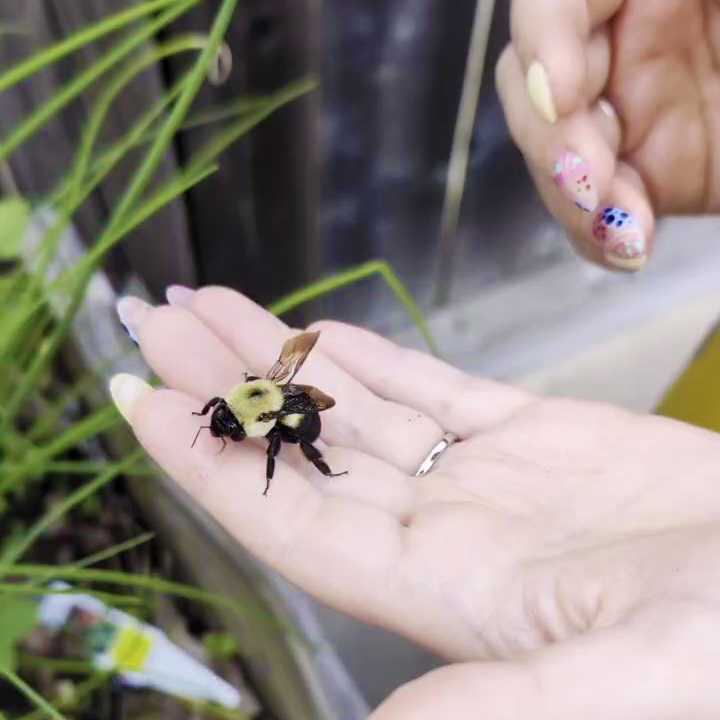 I offered her a bee home I had, I feed her and she would not leave my hand for some time. I let her settle in my garden to rest eventually, wondering if she would be there the next day.